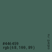 Цвет #446459 в цветовой модели RGB обозначается тремя октетами (68, 100, 89) в десятичном формате и #446459 в шестнадцатиричном (hex) формате, которые являются интенсивностью красного 68 (hex 44), интенсивность зелёного 100 (hex 64) и интенсивность синего 89 (hex 59).