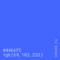 Цвет #4466FC в цветовой модели RGB обозначается тремя октетами (68, 102, 252) в десятичном формате и #4466FC в шестнадцатиричном (hex) формате, которые являются интенсивностью красного 68 (hex 44), интенсивность зелёного 102 (hex 66) и интенсивность синего 252 (hex FC).