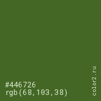 Цвет #446726 в цветовой модели RGB обозначается тремя октетами (68, 103, 38) в десятичном формате и #446726 в шестнадцатиричном (hex) формате, которые являются интенсивностью красного 68 (hex 44), интенсивность зелёного 103 (hex 67) и интенсивность синего 38 (hex 26).