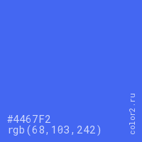 Цвет #4467F2 в цветовой модели RGB обозначается тремя октетами (68, 103, 242) в десятичном формате и #4467F2 в шестнадцатиричном (hex) формате, которые являются интенсивностью красного 68 (hex 44), интенсивность зелёного 103 (hex 67) и интенсивность синего 242 (hex F2).