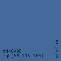 Цвет #446A9B в цветовой модели RGB обозначается тремя октетами (68, 106, 155) в десятичном формате и #446A9B в шестнадцатиричном (hex) формате, которые являются интенсивностью красного 68 (hex 44), интенсивность зелёного 106 (hex 6A) и интенсивность синего 155 (hex 9B).