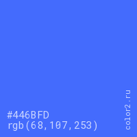 Цвет #446BFD в цветовой модели RGB обозначается тремя октетами (68, 107, 253) в десятичном формате и #446BFD в шестнадцатиричном (hex) формате, которые являются интенсивностью красного 68 (hex 44), интенсивность зелёного 107 (hex 6B) и интенсивность синего 253 (hex FD).