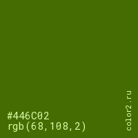 Цвет #446C02 в цветовой модели RGB обозначается тремя октетами (68, 108, 2) в десятичном формате и #446C02 в шестнадцатиричном (hex) формате, которые являются интенсивностью красного 68 (hex 44), интенсивность зелёного 108 (hex 6C) и интенсивность синего 2 (hex 02).