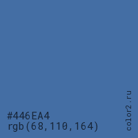 Цвет #446EA4 в цветовой модели RGB обозначается тремя октетами (68, 110, 164) в десятичном формате и #446EA4 в шестнадцатиричном (hex) формате, которые являются интенсивностью красного 68 (hex 44), интенсивность зелёного 110 (hex 6E) и интенсивность синего 164 (hex A4).