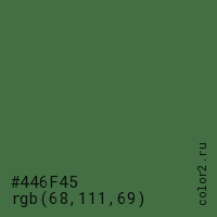 Цвет #446F45 в цветовой модели RGB обозначается тремя октетами (68, 111, 69) в десятичном формате и #446F45 в шестнадцатиричном (hex) формате, которые являются интенсивностью красного 68 (hex 44), интенсивность зелёного 111 (hex 6F) и интенсивность синего 69 (hex 45).