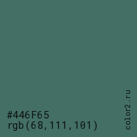 Цвет #446F65 в цветовой модели RGB обозначается тремя октетами (68, 111, 101) в десятичном формате и #446F65 в шестнадцатиричном (hex) формате, которые являются интенсивностью красного 68 (hex 44), интенсивность зелёного 111 (hex 6F) и интенсивность синего 101 (hex 65).