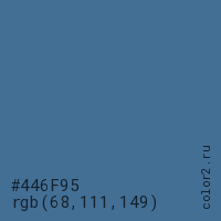 Цвет #446F95 в цветовой модели RGB обозначается тремя октетами (68, 111, 149) в десятичном формате и #446F95 в шестнадцатиричном (hex) формате, которые являются интенсивностью красного 68 (hex 44), интенсивность зелёного 111 (hex 6F) и интенсивность синего 149 (hex 95).