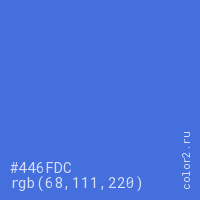 Цвет #446FDC в цветовой модели RGB обозначается тремя октетами (68, 111, 220) в десятичном формате и #446FDC в шестнадцатиричном (hex) формате, которые являются интенсивностью красного 68 (hex 44), интенсивность зелёного 111 (hex 6F) и интенсивность синего 220 (hex DC).