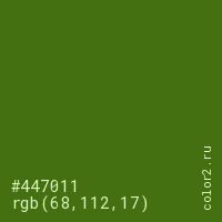Цвет #447011 в цветовой модели RGB обозначается тремя октетами (68, 112, 17) в десятичном формате и #447011 в шестнадцатиричном (hex) формате, которые являются интенсивностью красного 68 (hex 44), интенсивность зелёного 112 (hex 70) и интенсивность синего 17 (hex 11).
