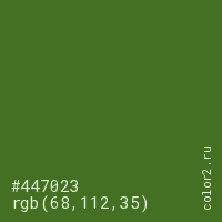 Цвет #447023 в цветовой модели RGB обозначается тремя октетами (68, 112, 35) в десятичном формате и #447023 в шестнадцатиричном (hex) формате, которые являются интенсивностью красного 68 (hex 44), интенсивность зелёного 112 (hex 70) и интенсивность синего 35 (hex 23).