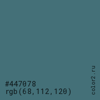 Цвет #447078 в цветовой модели RGB обозначается тремя октетами (68, 112, 120) в десятичном формате и #447078 в шестнадцатиричном (hex) формате, которые являются интенсивностью красного 68 (hex 44), интенсивность зелёного 112 (hex 70) и интенсивность синего 120 (hex 78).