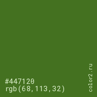 Цвет #447120 в цветовой модели RGB обозначается тремя октетами (68, 113, 32) в десятичном формате и #447120 в шестнадцатиричном (hex) формате, которые являются интенсивностью красного 68 (hex 44), интенсивность зелёного 113 (hex 71) и интенсивность синего 32 (hex 20).
