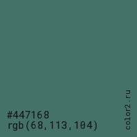 Цвет #447168 в цветовой модели RGB обозначается тремя октетами (68, 113, 104) в десятичном формате и #447168 в шестнадцатиричном (hex) формате, которые являются интенсивностью красного 68 (hex 44), интенсивность зелёного 113 (hex 71) и интенсивность синего 104 (hex 68).