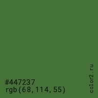 Цвет #447237 в цветовой модели RGB обозначается тремя октетами (68, 114, 55) в десятичном формате и #447237 в шестнадцатиричном (hex) формате, которые являются интенсивностью красного 68 (hex 44), интенсивность зелёного 114 (hex 72) и интенсивность синего 55 (hex 37).