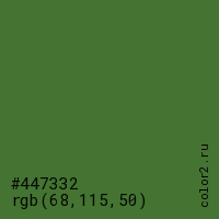 Цвет #447332 в цветовой модели RGB обозначается тремя октетами (68, 115, 50) в десятичном формате и #447332 в шестнадцатиричном (hex) формате, которые являются интенсивностью красного 68 (hex 44), интенсивность зелёного 115 (hex 73) и интенсивность синего 50 (hex 32).