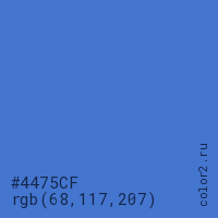 Цвет #4475CF в цветовой модели RGB обозначается тремя октетами (68, 117, 207) в десятичном формате и #4475CF в шестнадцатиричном (hex) формате, которые являются интенсивностью красного 68 (hex 44), интенсивность зелёного 117 (hex 75) и интенсивность синего 207 (hex CF).