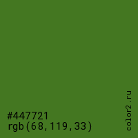 Цвет #447721 в цветовой модели RGB обозначается тремя октетами (68, 119, 33) в десятичном формате и #447721 в шестнадцатиричном (hex) формате, которые являются интенсивностью красного 68 (hex 44), интенсивность зелёного 119 (hex 77) и интенсивность синего 33 (hex 21).