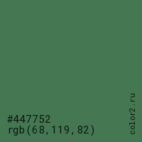 Цвет #447752 в цветовой модели RGB обозначается тремя октетами (68, 119, 82) в десятичном формате и #447752 в шестнадцатиричном (hex) формате, которые являются интенсивностью красного 68 (hex 44), интенсивность зелёного 119 (hex 77) и интенсивность синего 82 (hex 52).