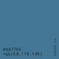 Цвет #447795 в цветовой модели RGB обозначается тремя октетами (68, 119, 149) в десятичном формате и #447795 в шестнадцатиричном (hex) формате, которые являются интенсивностью красного 68 (hex 44), интенсивность зелёного 119 (hex 77) и интенсивность синего 149 (hex 95).