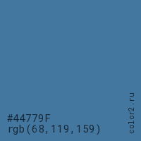 Цвет #44779F в цветовой модели RGB обозначается тремя октетами (68, 119, 159) в десятичном формате и #44779F в шестнадцатиричном (hex) формате, которые являются интенсивностью красного 68 (hex 44), интенсивность зелёного 119 (hex 77) и интенсивность синего 159 (hex 9F).