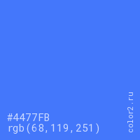 Цвет #4477FB в цветовой модели RGB обозначается тремя октетами (68, 119, 251) в десятичном формате и #4477FB в шестнадцатиричном (hex) формате, которые являются интенсивностью красного 68 (hex 44), интенсивность зелёного 119 (hex 77) и интенсивность синего 251 (hex FB).