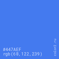 Цвет #447AEF в цветовой модели RGB обозначается тремя октетами (68, 122, 239) в десятичном формате и #447AEF в шестнадцатиричном (hex) формате, которые являются интенсивностью красного 68 (hex 44), интенсивность зелёного 122 (hex 7A) и интенсивность синего 239 (hex EF).