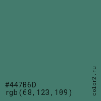 Цвет #447B6D в цветовой модели RGB обозначается тремя октетами (68, 123, 109) в десятичном формате и #447B6D в шестнадцатиричном (hex) формате, которые являются интенсивностью красного 68 (hex 44), интенсивность зелёного 123 (hex 7B) и интенсивность синего 109 (hex 6D).