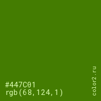 Цвет #447C01 в цветовой модели RGB обозначается тремя октетами (68, 124, 1) в десятичном формате и #447C01 в шестнадцатиричном (hex) формате, которые являются интенсивностью красного 68 (hex 44), интенсивность зелёного 124 (hex 7C) и интенсивность синего 1 (hex 01).