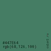 Цвет #447E64 в цветовой модели RGB обозначается тремя октетами (68, 126, 100) в десятичном формате и #447E64 в шестнадцатиричном (hex) формате, которые являются интенсивностью красного 68 (hex 44), интенсивность зелёного 126 (hex 7E) и интенсивность синего 100 (hex 64).