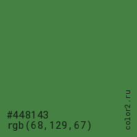 Цвет #448143 в цветовой модели RGB обозначается тремя октетами (68, 129, 67) в десятичном формате и #448143 в шестнадцатиричном (hex) формате, которые являются интенсивностью красного 68 (hex 44), интенсивность зелёного 129 (hex 81) и интенсивность синего 67 (hex 43).