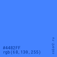 Цвет #4482FF в цветовой модели RGB обозначается тремя октетами (68, 130, 255) в десятичном формате и #4482FF в шестнадцатиричном (hex) формате, которые являются интенсивностью красного 68 (hex 44), интенсивность зелёного 130 (hex 82) и интенсивность синего 255 (hex FF).