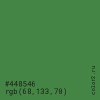 Цвет #448546 в цветовой модели RGB обозначается тремя октетами (68, 133, 70) в десятичном формате и #448546 в шестнадцатиричном (hex) формате, которые являются интенсивностью красного 68 (hex 44), интенсивность зелёного 133 (hex 85) и интенсивность синего 70 (hex 46).