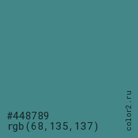 Цвет #448789 в цветовой модели RGB обозначается тремя октетами (68, 135, 137) в десятичном формате и #448789 в шестнадцатиричном (hex) формате, которые являются интенсивностью красного 68 (hex 44), интенсивность зелёного 135 (hex 87) и интенсивность синего 137 (hex 89).