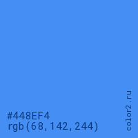 Цвет #448EF4 в цветовой модели RGB обозначается тремя октетами (68, 142, 244) в десятичном формате и #448EF4 в шестнадцатиричном (hex) формате, которые являются интенсивностью красного 68 (hex 44), интенсивность зелёного 142 (hex 8E) и интенсивность синего 244 (hex F4).