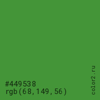 Цвет #449538 в цветовой модели RGB обозначается тремя октетами (68, 149, 56) в десятичном формате и #449538 в шестнадцатиричном (hex) формате, которые являются интенсивностью красного 68 (hex 44), интенсивность зелёного 149 (hex 95) и интенсивность синего 56 (hex 38).