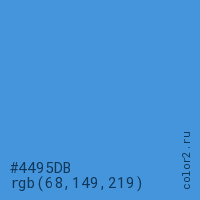 Цвет #4495DB в цветовой модели RGB обозначается тремя октетами (68, 149, 219) в десятичном формате и #4495DB в шестнадцатиричном (hex) формате, которые являются интенсивностью красного 68 (hex 44), интенсивность зелёного 149 (hex 95) и интенсивность синего 219 (hex DB).
