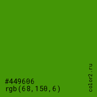 Цвет #449606 в цветовой модели RGB обозначается тремя октетами (68, 150, 6) в десятичном формате и #449606 в шестнадцатиричном (hex) формате, которые являются интенсивностью красного 68 (hex 44), интенсивность зелёного 150 (hex 96) и интенсивность синего 6 (hex 06).