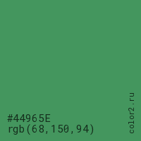 Цвет #44965E в цветовой модели RGB обозначается тремя октетами (68, 150, 94) в десятичном формате и #44965E в шестнадцатиричном (hex) формате, которые являются интенсивностью красного 68 (hex 44), интенсивность зелёного 150 (hex 96) и интенсивность синего 94 (hex 5E).
