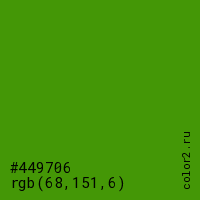 Цвет #449706 в цветовой модели RGB обозначается тремя октетами (68, 151, 6) в десятичном формате и #449706 в шестнадцатиричном (hex) формате, которые являются интенсивностью красного 68 (hex 44), интенсивность зелёного 151 (hex 97) и интенсивность синего 6 (hex 06).