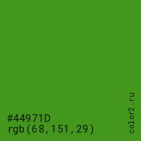 Цвет #44971D в цветовой модели RGB обозначается тремя октетами (68, 151, 29) в десятичном формате и #44971D в шестнадцатиричном (hex) формате, которые являются интенсивностью красного 68 (hex 44), интенсивность зелёного 151 (hex 97) и интенсивность синего 29 (hex 1D).