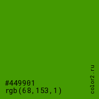 Цвет #449901 в цветовой модели RGB обозначается тремя октетами (68, 153, 1) в десятичном формате и #449901 в шестнадцатиричном (hex) формате, которые являются интенсивностью красного 68 (hex 44), интенсивность зелёного 153 (hex 99) и интенсивность синего 1 (hex 01).