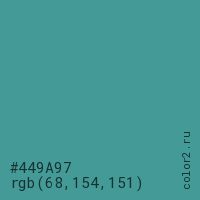 Цвет #449A97 в цветовой модели RGB обозначается тремя октетами (68, 154, 151) в десятичном формате и #449A97 в шестнадцатиричном (hex) формате, которые являются интенсивностью красного 68 (hex 44), интенсивность зелёного 154 (hex 9A) и интенсивность синего 151 (hex 97).
