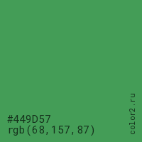 Цвет #449D57 в цветовой модели RGB обозначается тремя октетами (68, 157, 87) в десятичном формате и #449D57 в шестнадцатиричном (hex) формате, которые являются интенсивностью красного 68 (hex 44), интенсивность зелёного 157 (hex 9D) и интенсивность синего 87 (hex 57).