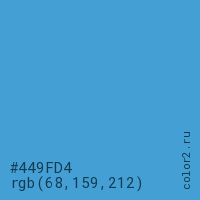 Цвет #449FD4 в цветовой модели RGB обозначается тремя октетами (68, 159, 212) в десятичном формате и #449FD4 в шестнадцатиричном (hex) формате, которые являются интенсивностью красного 68 (hex 44), интенсивность зелёного 159 (hex 9F) и интенсивность синего 212 (hex D4).