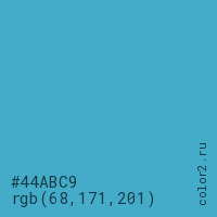 Цвет #44ABC9 в цветовой модели RGB обозначается тремя октетами (68, 171, 201) в десятичном формате и #44ABC9 в шестнадцатиричном (hex) формате, которые являются интенсивностью красного 68 (hex 44), интенсивность зелёного 171 (hex AB) и интенсивность синего 201 (hex C9).