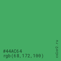 Цвет #44AC64 в цветовой модели RGB обозначается тремя октетами (68, 172, 100) в десятичном формате и #44AC64 в шестнадцатиричном (hex) формате, которые являются интенсивностью красного 68 (hex 44), интенсивность зелёного 172 (hex AC) и интенсивность синего 100 (hex 64).