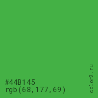 Цвет #44B145 в цветовой модели RGB обозначается тремя октетами (68, 177, 69) в десятичном формате и #44B145 в шестнадцатиричном (hex) формате, которые являются интенсивностью красного 68 (hex 44), интенсивность зелёного 177 (hex B1) и интенсивность синего 69 (hex 45).