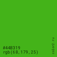 Цвет #44B319 в цветовой модели RGB обозначается тремя октетами (68, 179, 25) в десятичном формате и #44B319 в шестнадцатиричном (hex) формате, которые являются интенсивностью красного 68 (hex 44), интенсивность зелёного 179 (hex B3) и интенсивность синего 25 (hex 19).