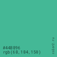 Цвет #44B896 в цветовой модели RGB обозначается тремя октетами (68, 184, 150) в десятичном формате и #44B896 в шестнадцатиричном (hex) формате, которые являются интенсивностью красного 68 (hex 44), интенсивность зелёного 184 (hex B8) и интенсивность синего 150 (hex 96).