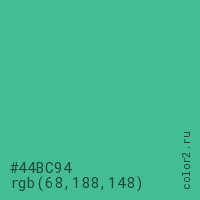 Цвет #44BC94 в цветовой модели RGB обозначается тремя октетами (68, 188, 148) в десятичном формате и #44BC94 в шестнадцатиричном (hex) формате, которые являются интенсивностью красного 68 (hex 44), интенсивность зелёного 188 (hex BC) и интенсивность синего 148 (hex 94).